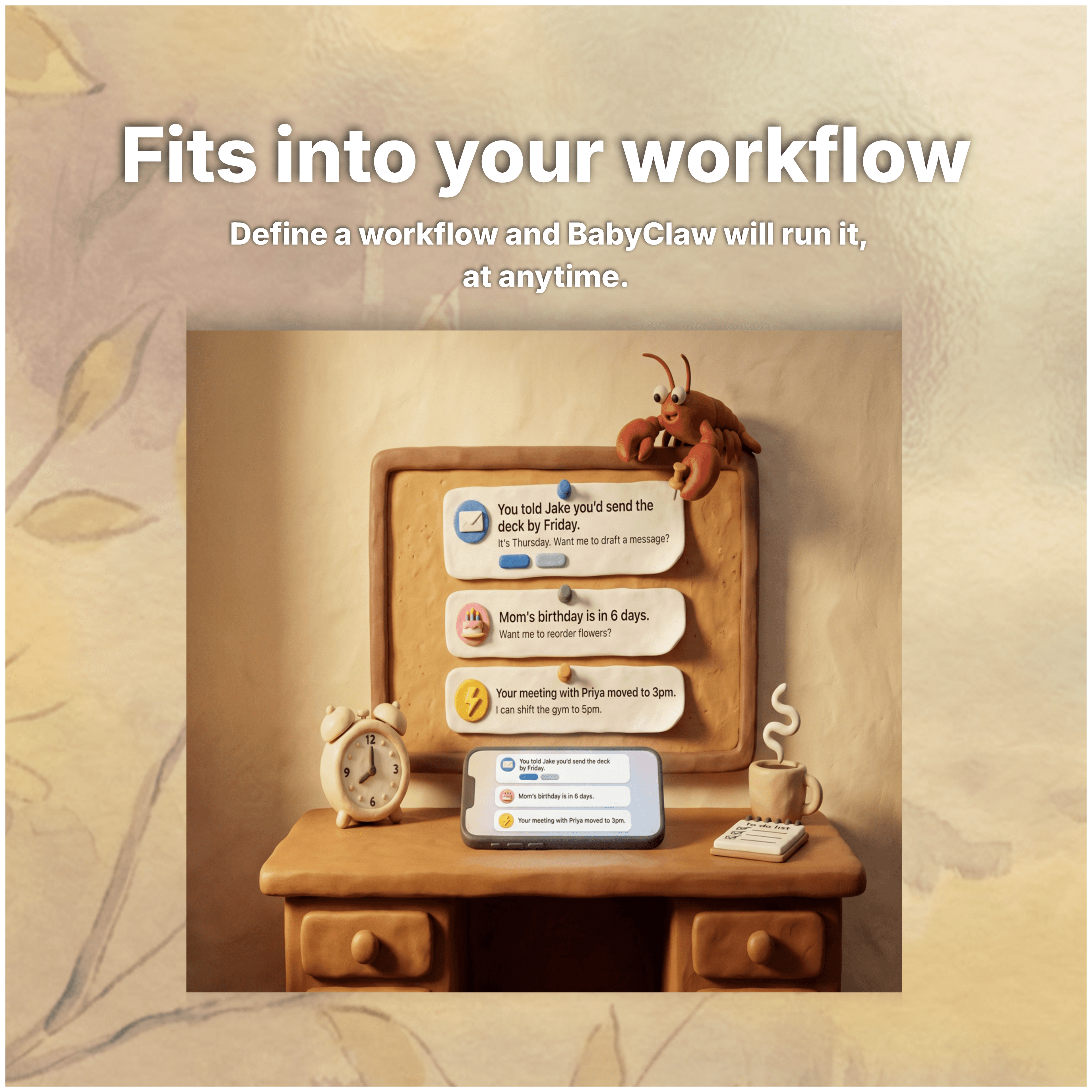 Tell BabyClaw once how you like things done, and it remembers. The first AI that actually learns from you.